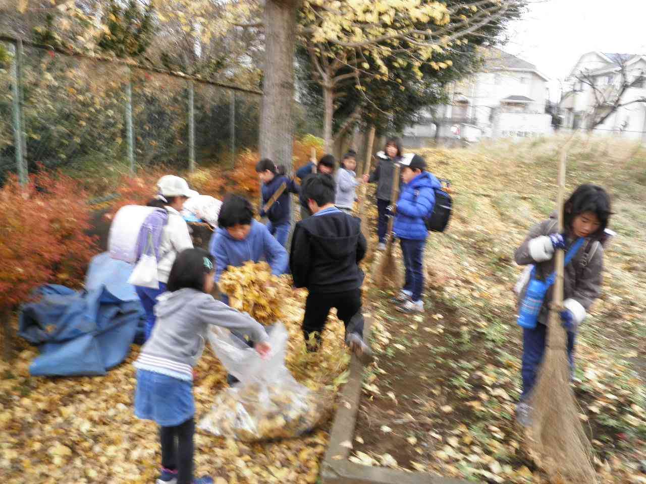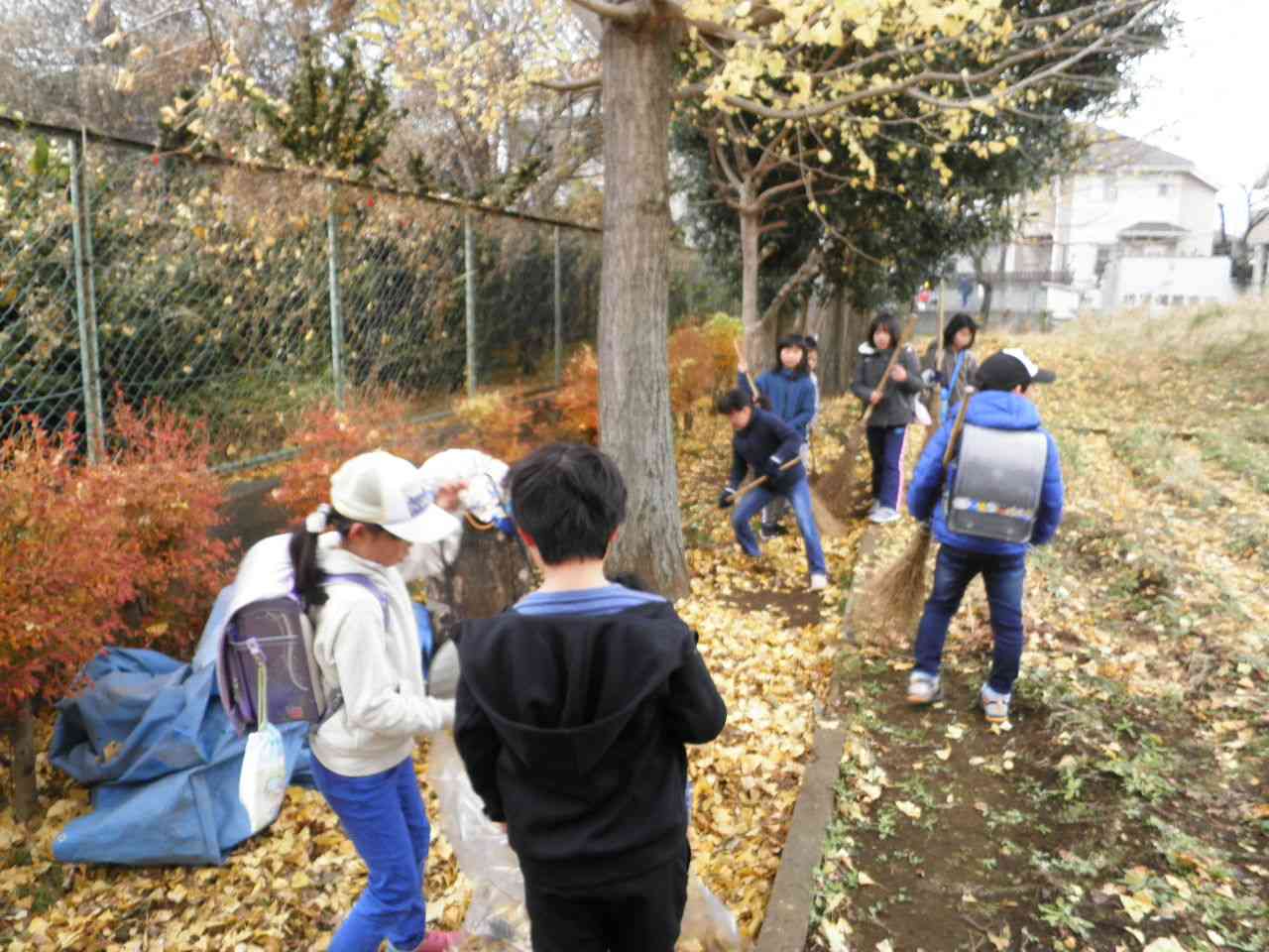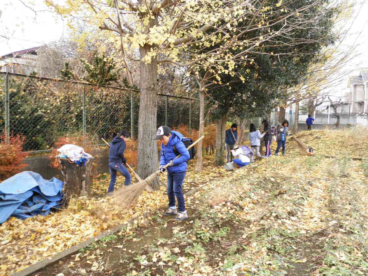 九小の校庭の樹木は、葉が色づきとてもきれいです。その分たくさん落ち葉があります。 朝、登校してきた子供たちが、校庭の落ち葉掃きをしてくれています。自主的に活動してくれることは、とても素晴らしいことです。