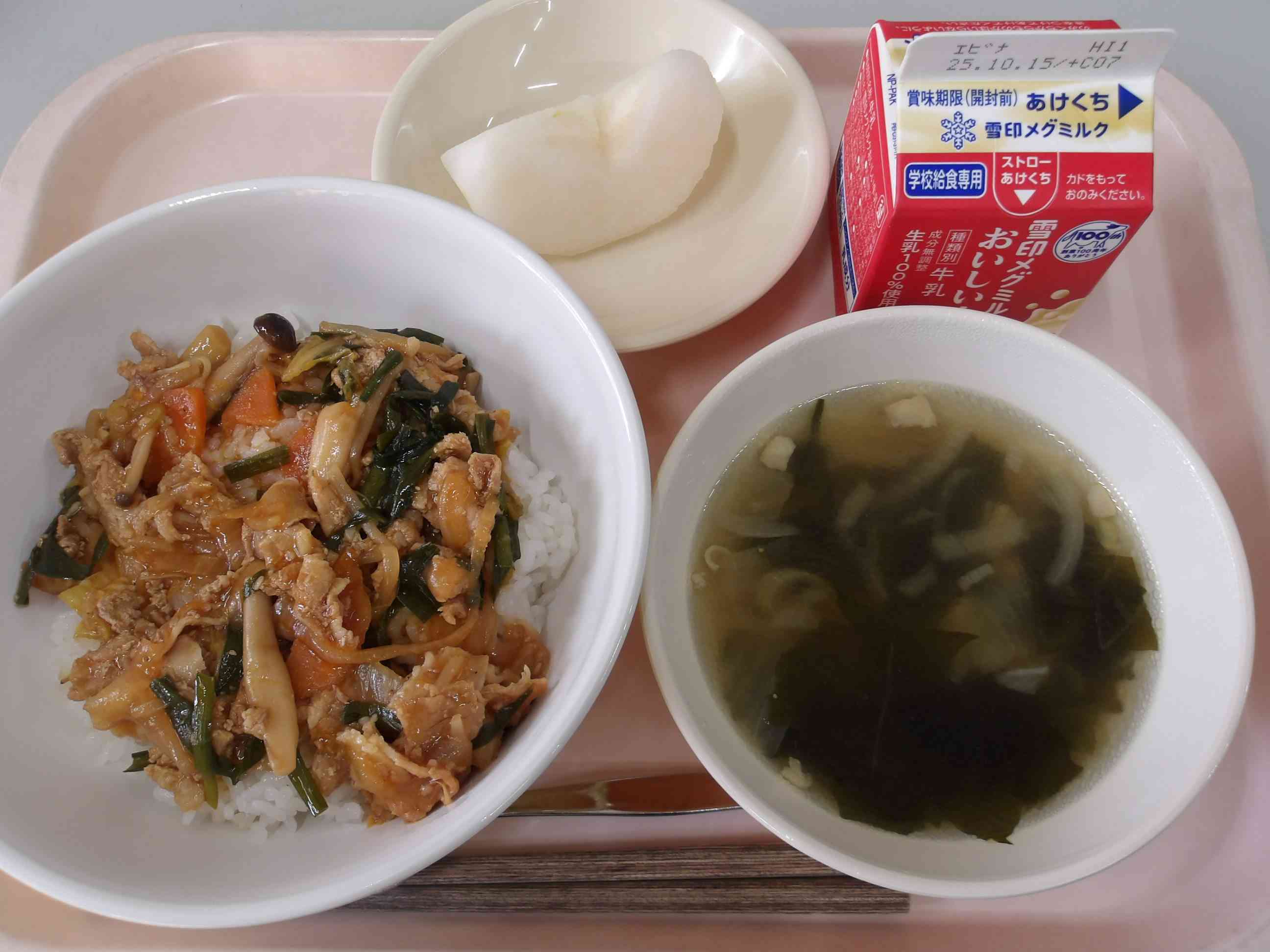 今日の給食 〇豚肉のプルコギ丼 〇わかめのスープ 〇梨 〇牛乳
