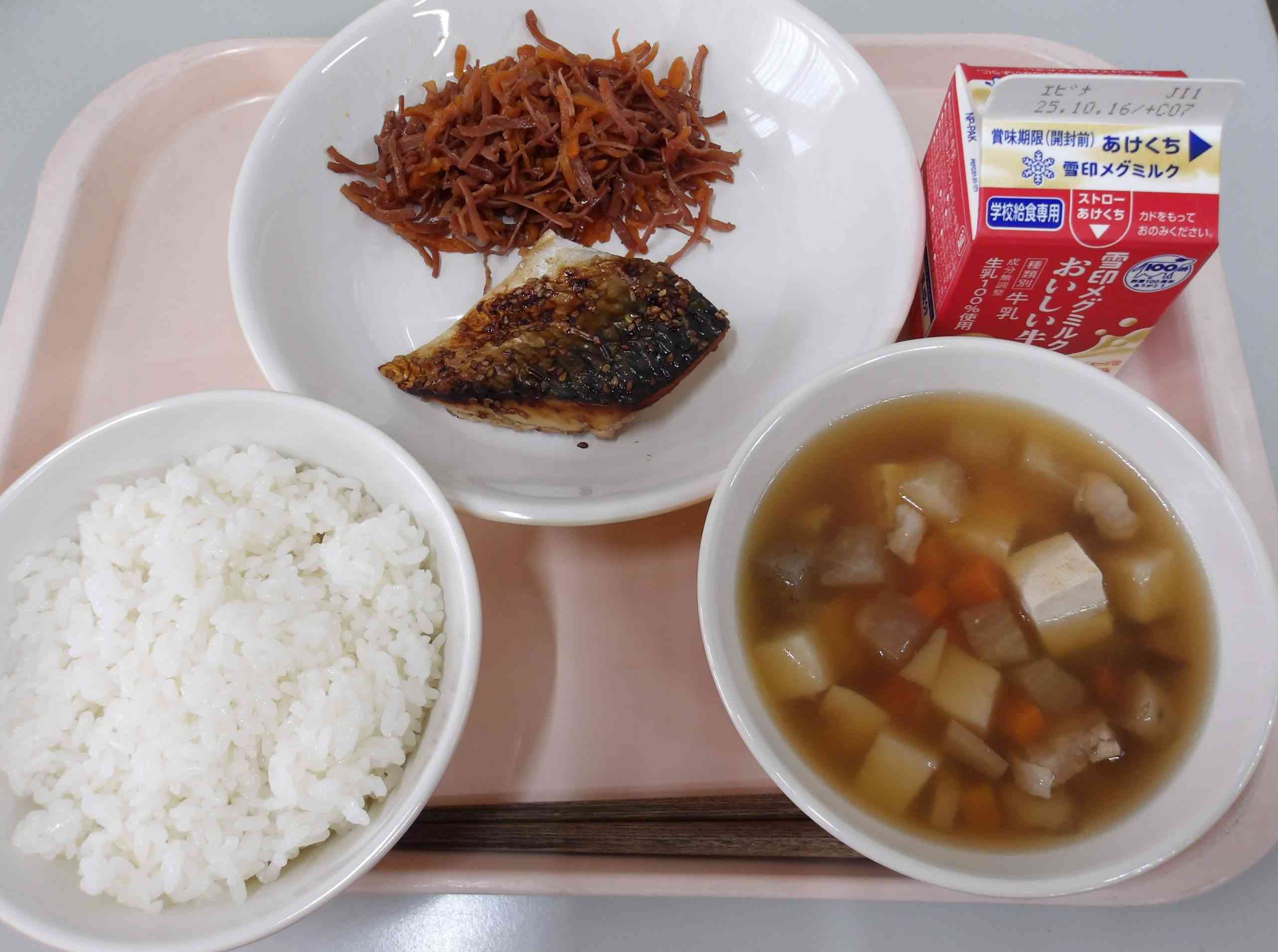 今日の給食 〇ご飯 〇さばの香味焼き 〇いかにんじん 〇ざくざく 〇牛乳