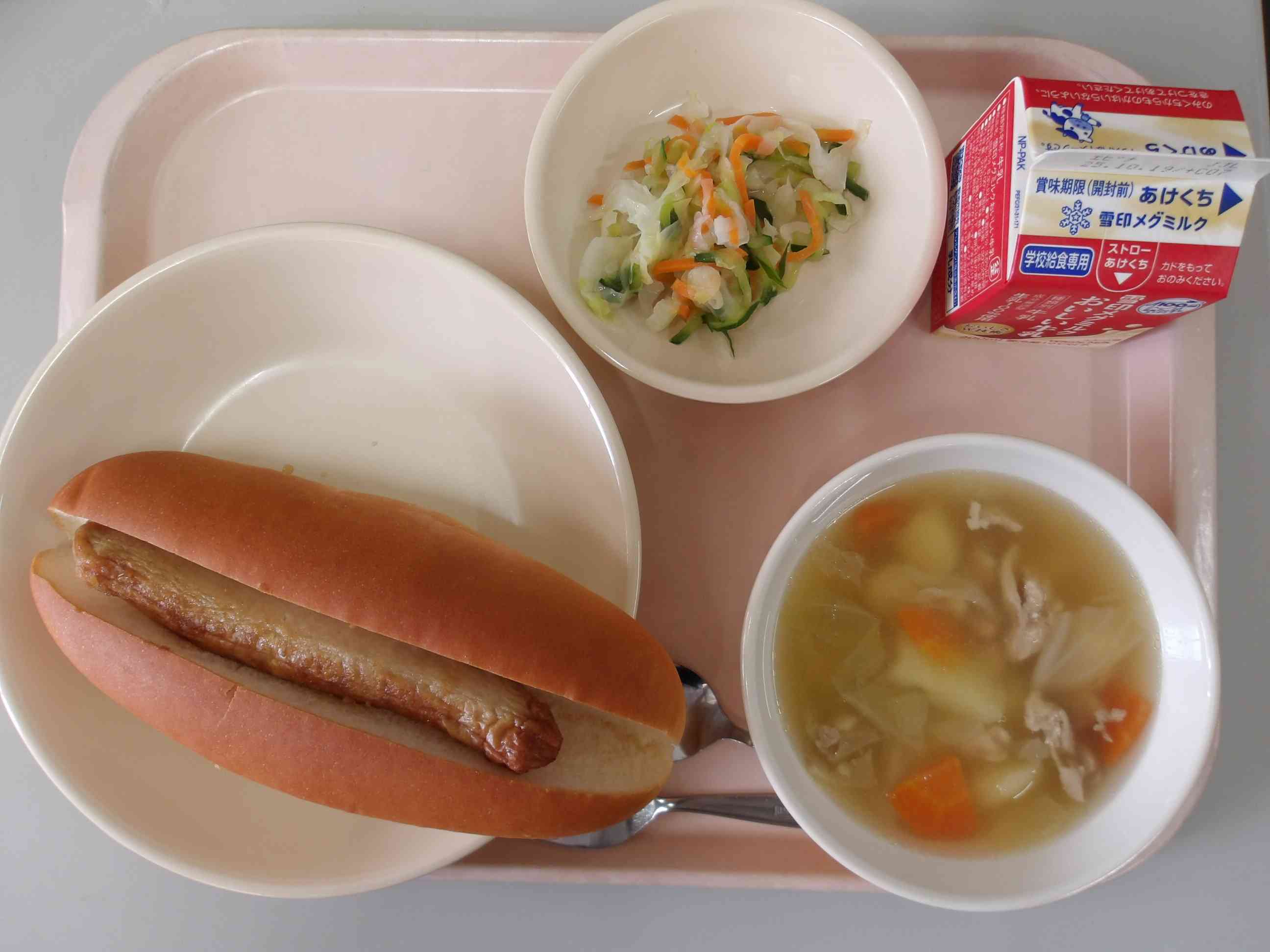 今日の給食 〇ホットドック 〇ポトフ 〇フレンチサラダ 〇牛乳