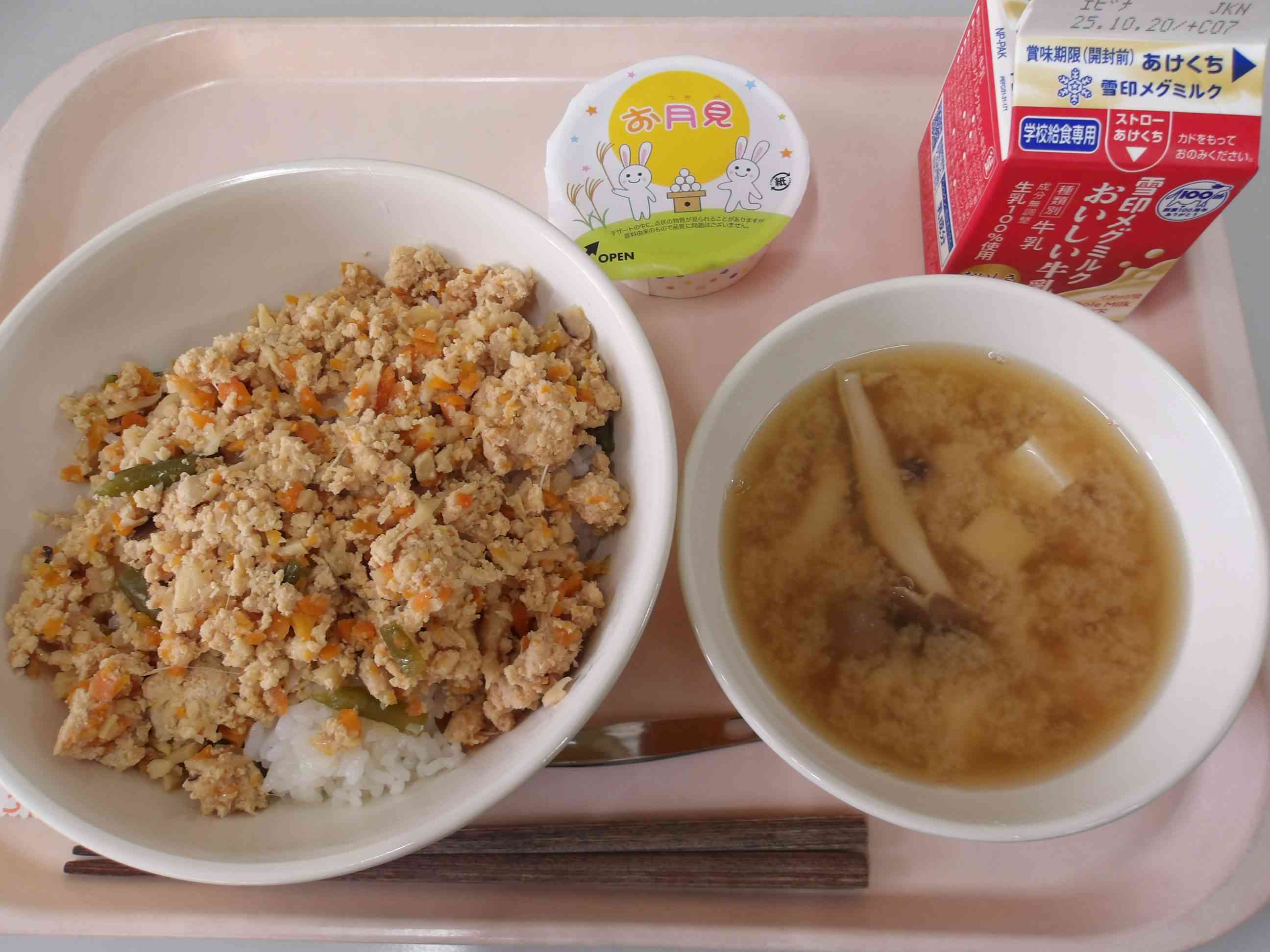 今日の給食 〇鳥そぼろ丼 〇里芋の味噌汁 〇十五夜ゼリー 〇牛乳