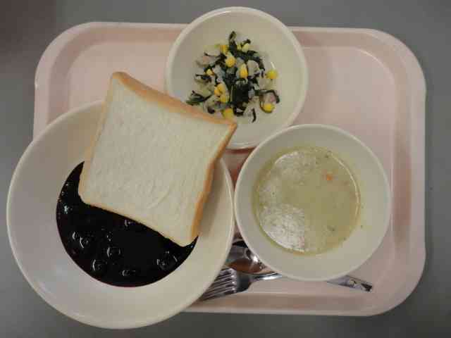 今日の給食 〇朝焼き食パン 〇サツマイモの豆乳ポタージュスープ 〇ほうれん草入りソテー 〇牛乳