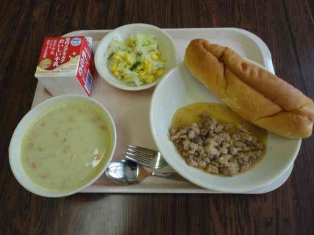 今日の給食 〇照り焼きチキンサンド 〇豆乳青大豆チャウダー 〇コールスローサラダ 〇牛乳