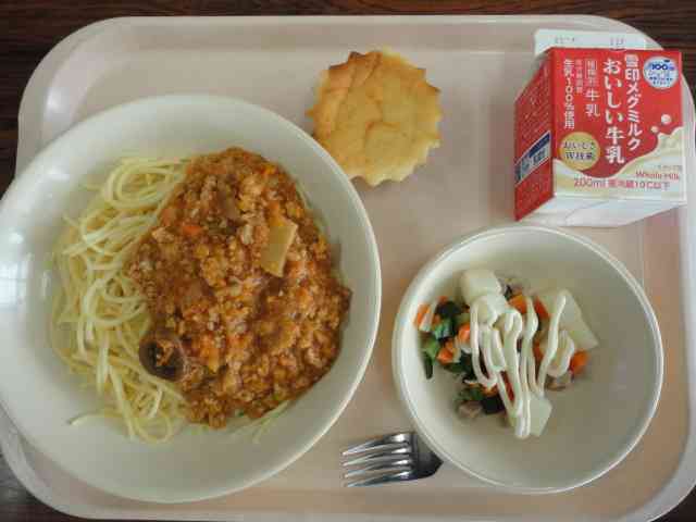 今日の給食 〇スパゲッティきのこミートソース 〇ポテトサラダ 〇東大和市産にんじんケーキ 〇牛乳