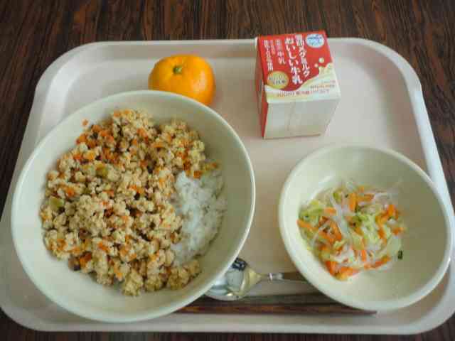 今日の給食 〇高野豆腐のそぼろ丼 〇春雨サラダ 〇みかん 〇牛乳