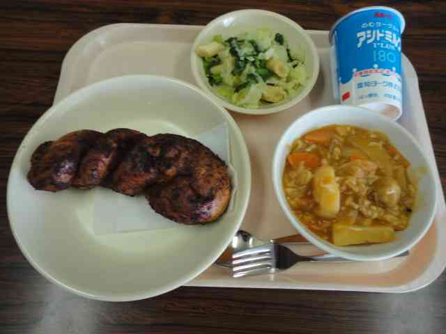 今日の給食 〇ココア揚げパン 〇肉団子入りABCトマトシチュー 〇ヤングコーンサラダ 〇ヨーグルトドリンク