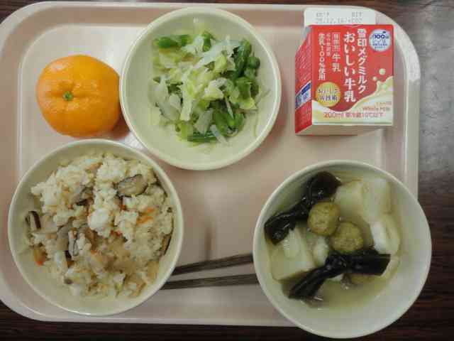今日の給食 〇鳥とレンコンのご飯 〇おでん 〇インゲンサラダ 〇みかん 〇牛乳