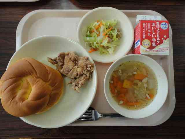 今日の給食 〇花型パンプキンパン 〇冬野菜のスープ煮 〇フライドチキン 〇ビーンズサラダ 〇牛乳