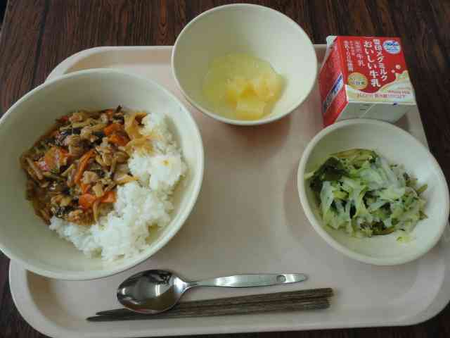 今日の給食 〇豚肉のプルコギ丼 〇海藻サラダ 〇レモンゼリー 〇牛乳
