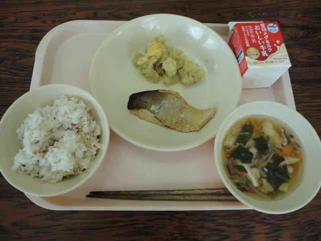 今日の給食 〇うめちりご飯 〇さわにわん 〇メダイの西京焼き 〇栗入りきんとん 〇牛乳
