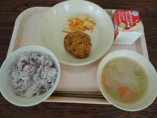 今日の給食 〇ゆかりご飯 〇ごじる 〇手作り里芋コロッケ 〇ヤングコーンサラダ 〇牛乳