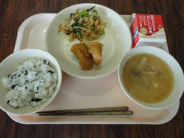 今日の給食 〇わかめごはん 〇しんたまねぎのみそしる 〇いかのからあげ 〇やさいのおかかあえ 〇ぎゅうにゅう