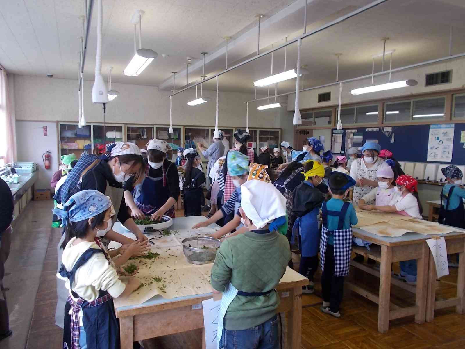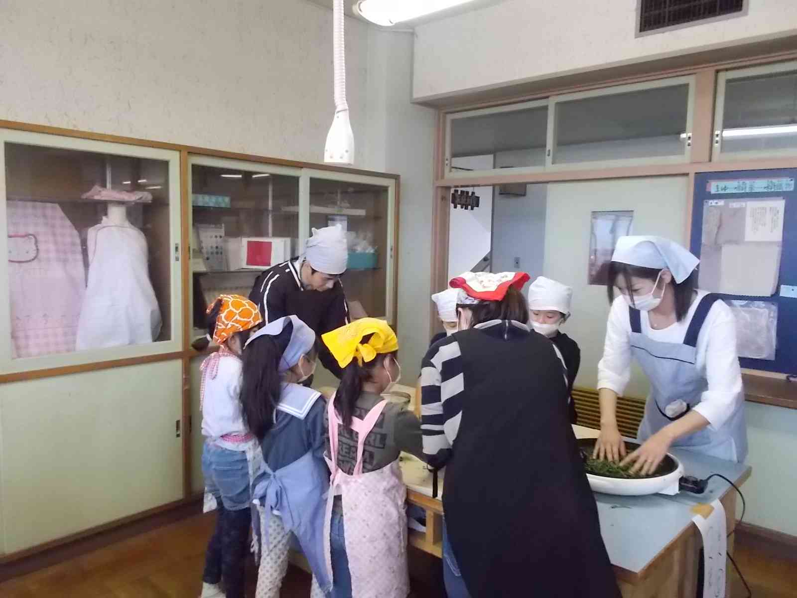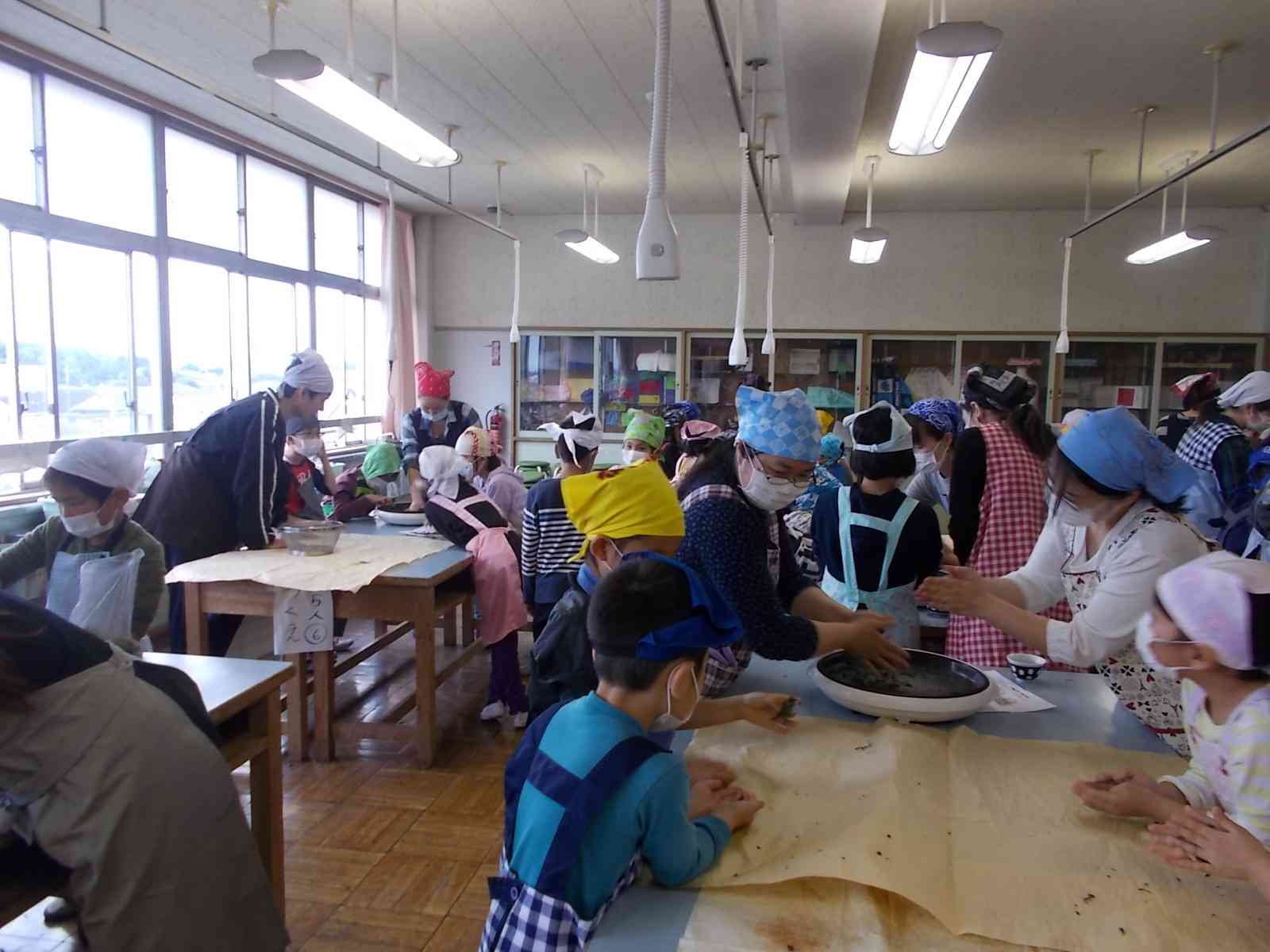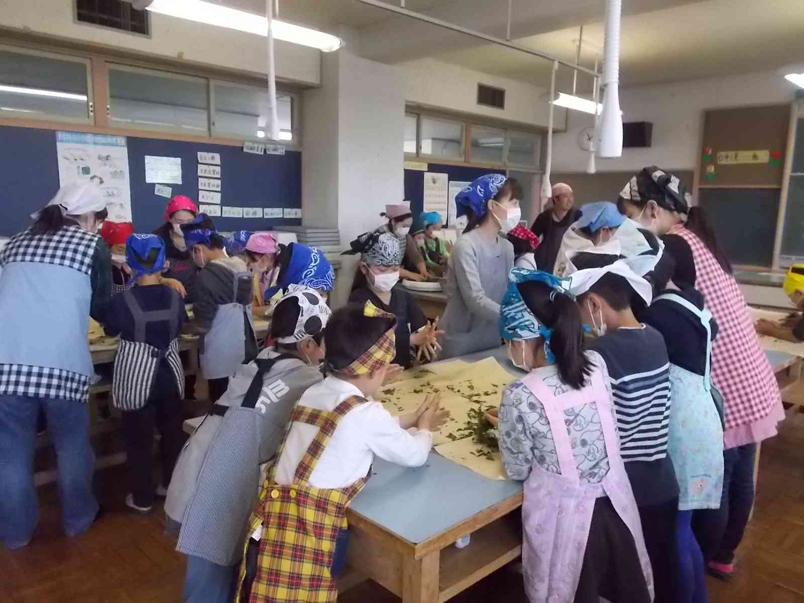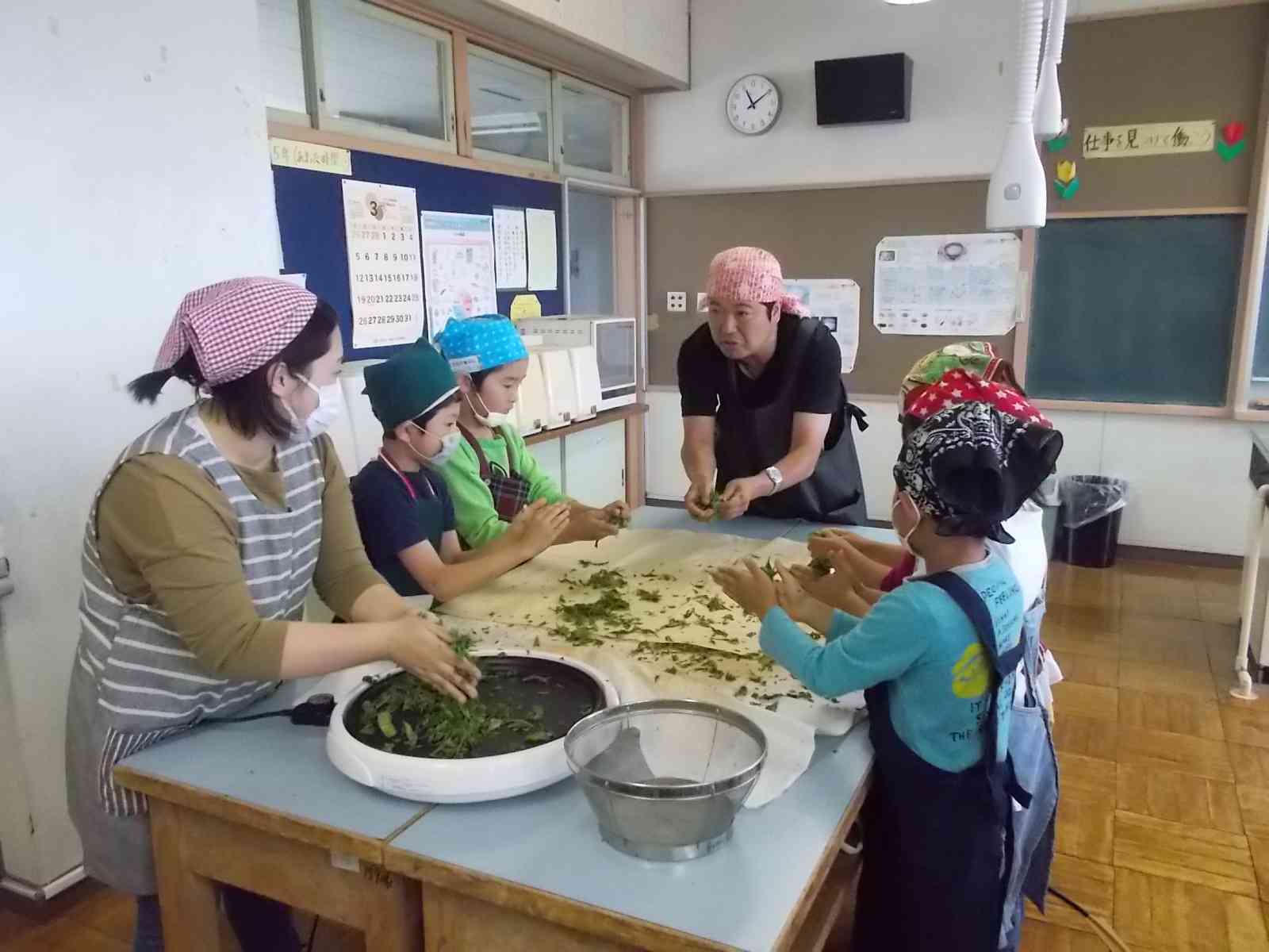次に学校に戻り、家庭科室にて製茶を行いました。蒸してほこりや汚れ、青くさみをとった後は、手で茶葉が乾燥するまでもみ続けます。