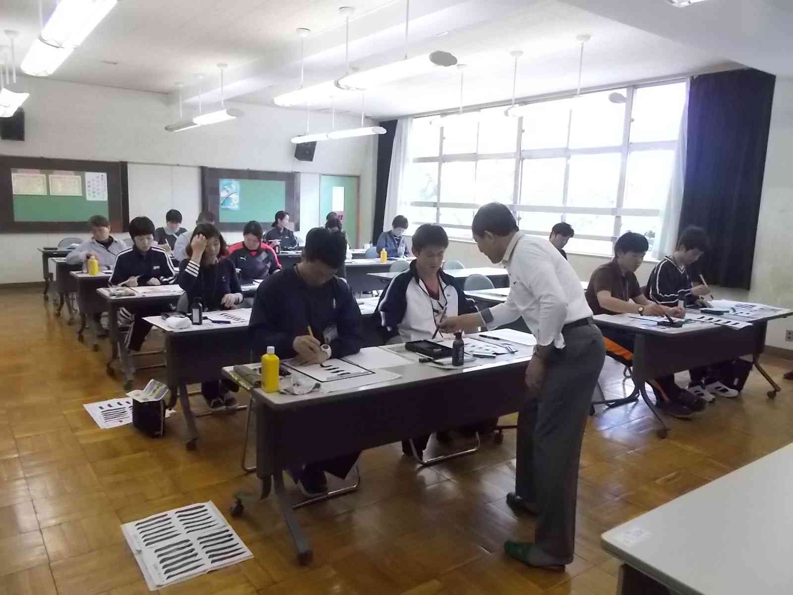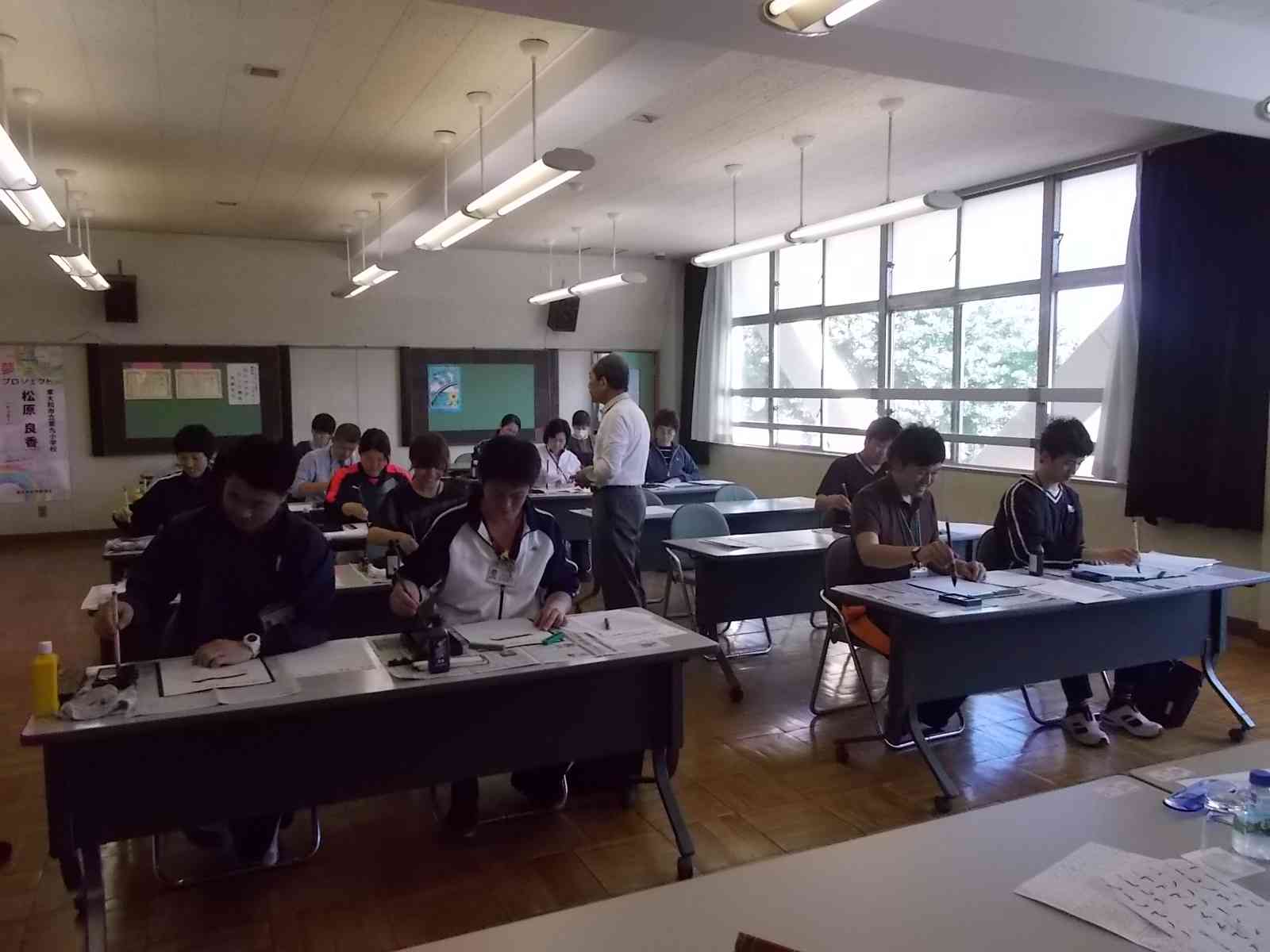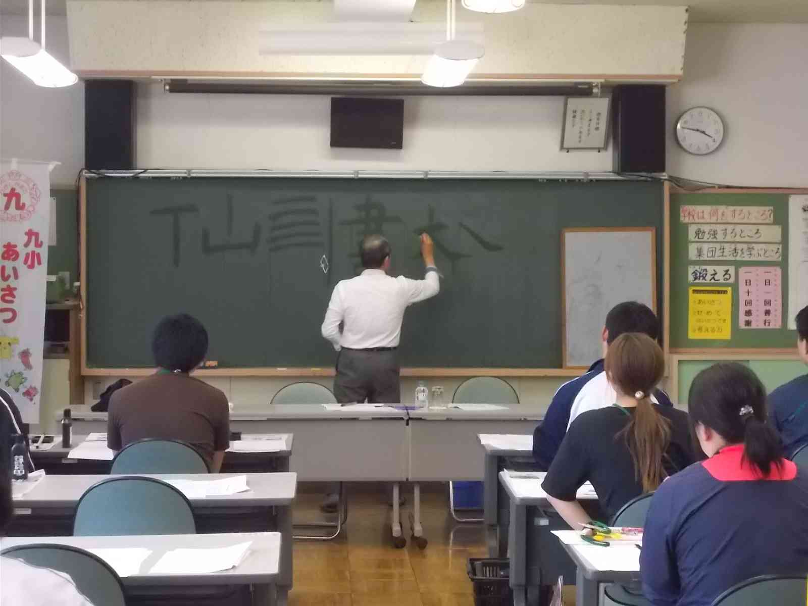 6時間目が終了した後、視聴覚室にて「書写の達人に学ぶ教員研修」を行いました。講師をお招きし、実際に筆を持って、書写の実技を学びました。どの先生たちもみんな真剣です。九小の子供たちのために、先生たちも勉強しています。