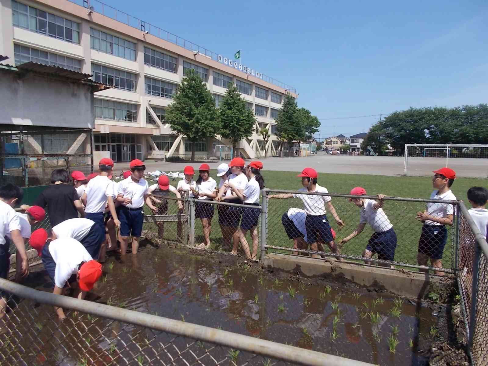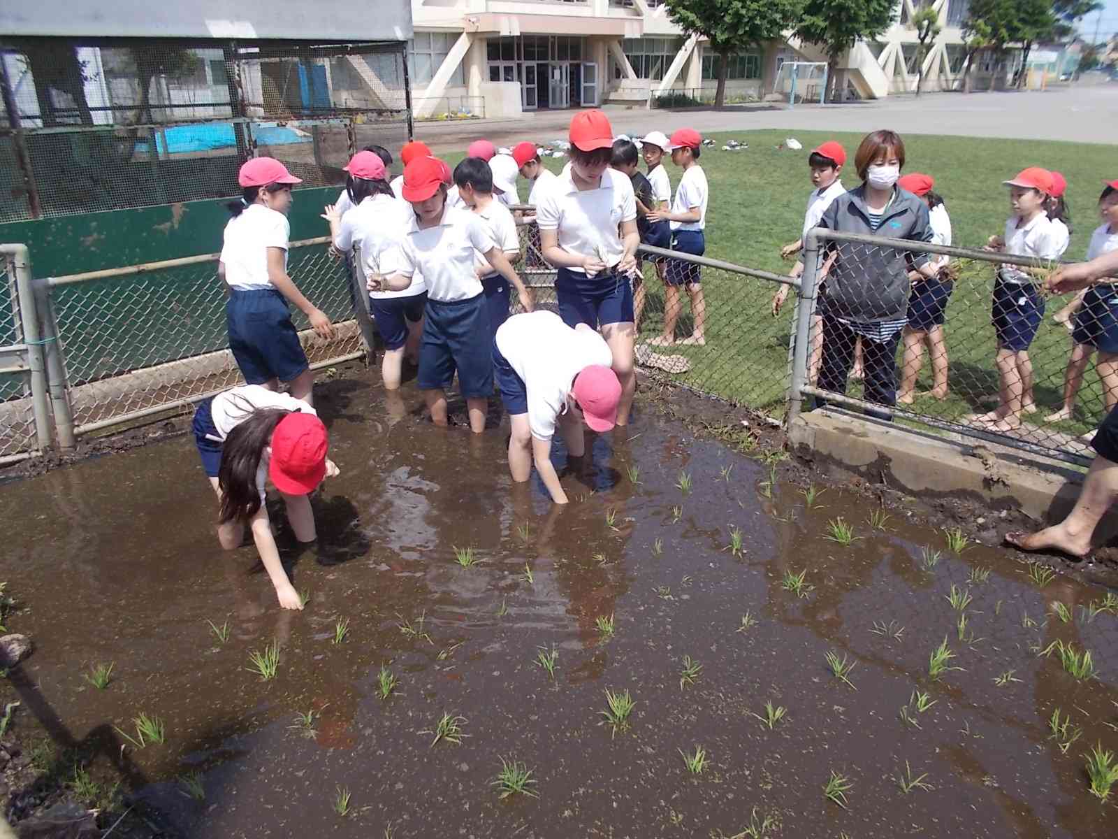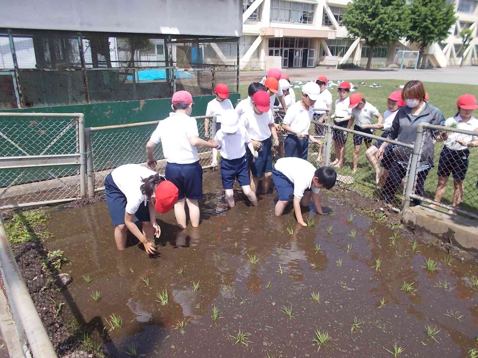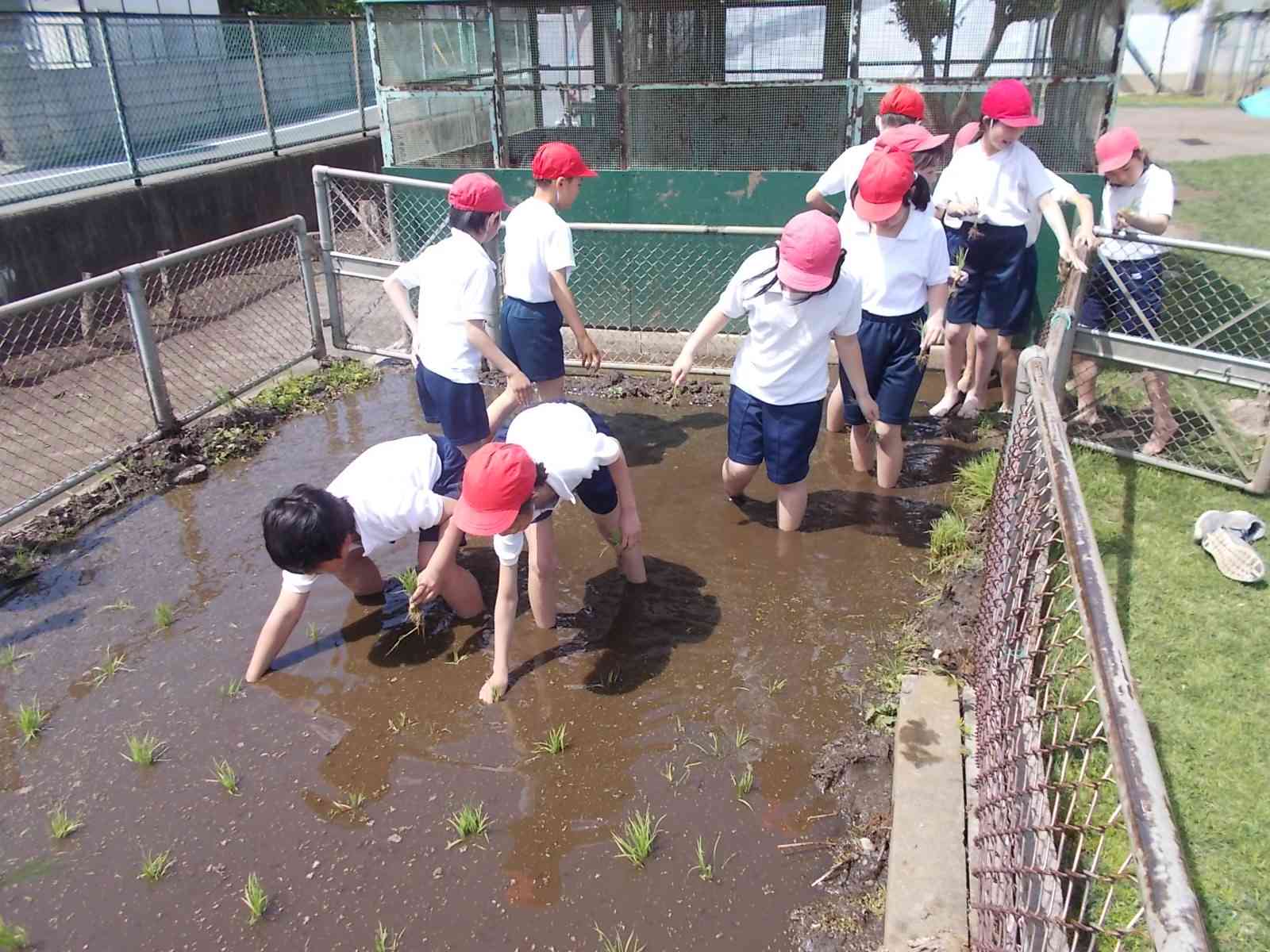 5年生は「育てよう九小田んぼ米作り」の学習をしています。これまでに田おこし・代かきを行い、今日はいよいよ田植えを行いました。 今日植えた苗が秋には大きく実るよう、一人一人が大切に育てていきます。
